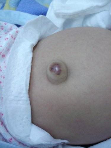 凸出的肚臍有時可能如同乒乓球大小,輕輕一壓可以將鼓出的內容物推回腹腔內。此時覆蓋肚臍的皮膚因而變得鬆鬆的,有經驗的醫師可以用手指觸摸出腹壁缺損大小,有些直徑小於1公分 ,極少部分的孩子大於5公分 。