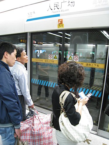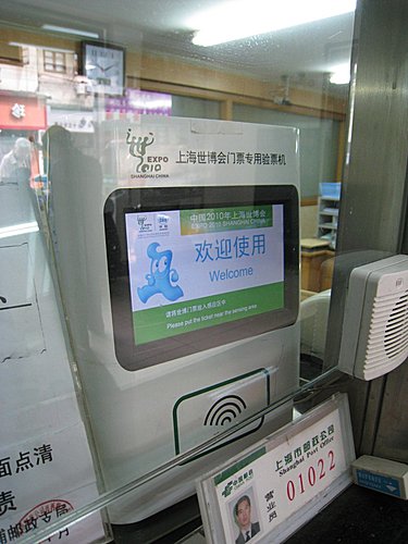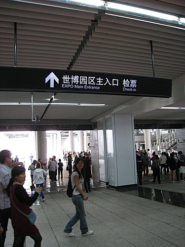 飯店的電視播放的內容是在教人民「識別假秤」,台灣好久沒教這件事了 跑了幾個地方,才買到兩張世博3次票(完全買不到1次票),郵局窗口還有驗票機。 搭乘地鐵往世博出發,此地鐵站令我終生難忘,最後一天搭乘時正好是上班時間,人潮多到連台北101跨年晚會都比不上,車門一打開,雙腳不須動作就已經被潮水擠入列車中,手上的行李箱無法放下,因為全都是腳,根本沒有地面。 到了世博入口,看到這個告示牌也別高興,大概還要再走20分鐘